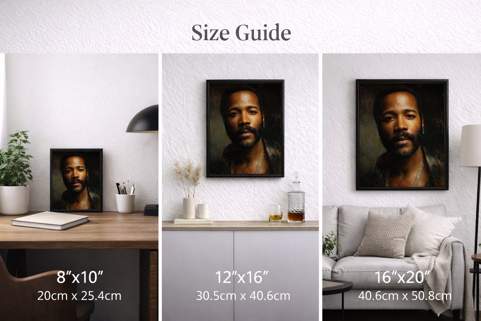 - Hand-framed (black or white) with floating frame effect